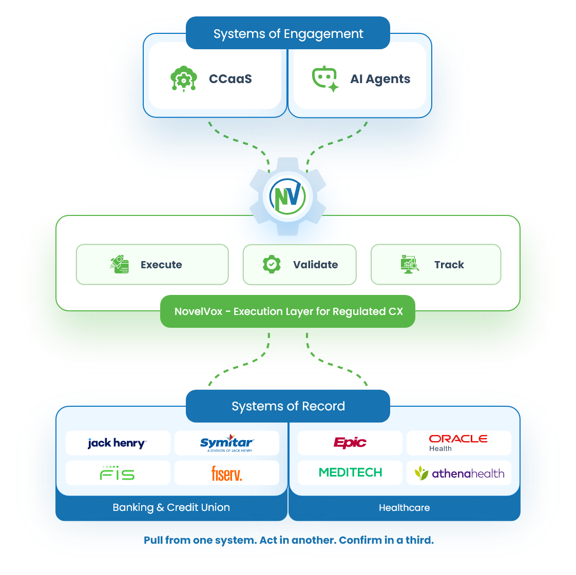 NovelVox delivers secure, scalable integrations across systems of record—EHR/EMR, Core Banking, Policy Administration, DMS, and CRM—and governs how regulated actions are executed during live customer interactions, with real-time policy enforcement, sequencing, and audit-grade traceability.