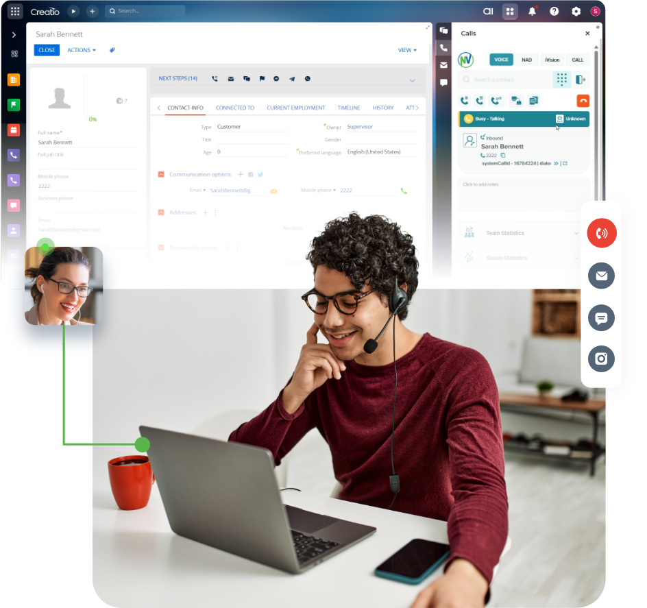 The NovelVox CTI Connector integrates directly into Creatio, equipping agents with essential telephony features like hold, mute, and transfer as well as powerful tools like Click-to-Dial, automated call logging, and ScreenPop of customer data. Empower agents with a single, unified view to handle every interaction with speed, ease, and full context.