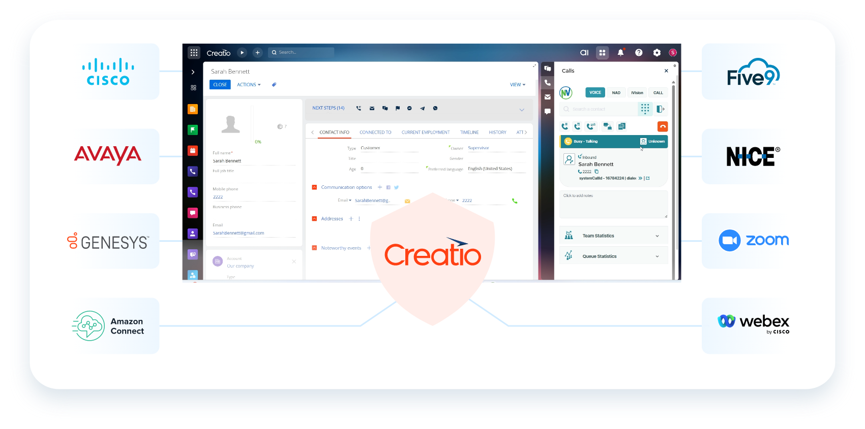 The NovelVox Smart CTI Connector for Creatio seamlessly integrates with all leading contact centers like Cisco, Genesys, Five9, Zoom, Avaya, Nice, and Amazon Connect thus enabling complete customer data and key call controls directly into the Creatio interface. This empowers agents to deliver personalized, confident, and context-rich interactions.