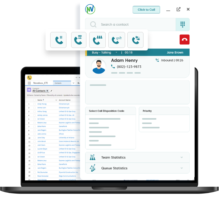 Empower agents with key caller information and call controls embedded within the Salesforce environment. With NovelVox Smart CTI Connector, create unique workflows to significantly improve First Contact Resolution scores by offering seamless Salesforce CRM integration with leading phone systems from Cisco Finesse, Webex, Avaya, Genesys, Amazon Connect, Five9, Zoom, Nice and Dialpad.