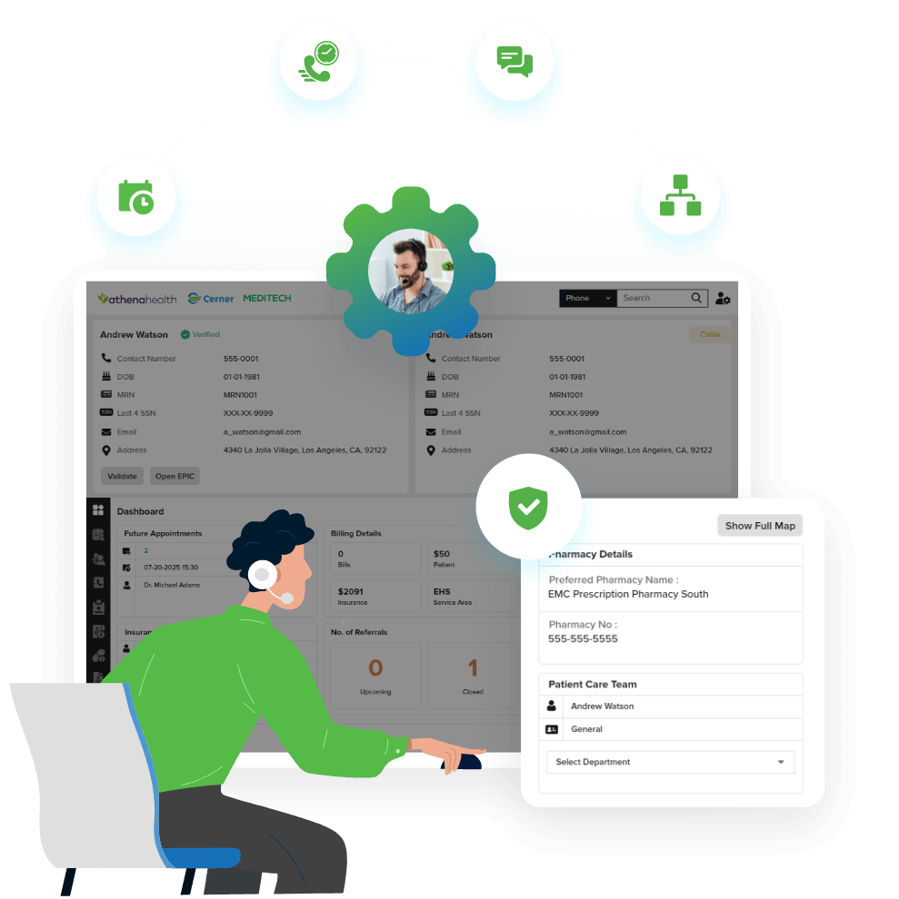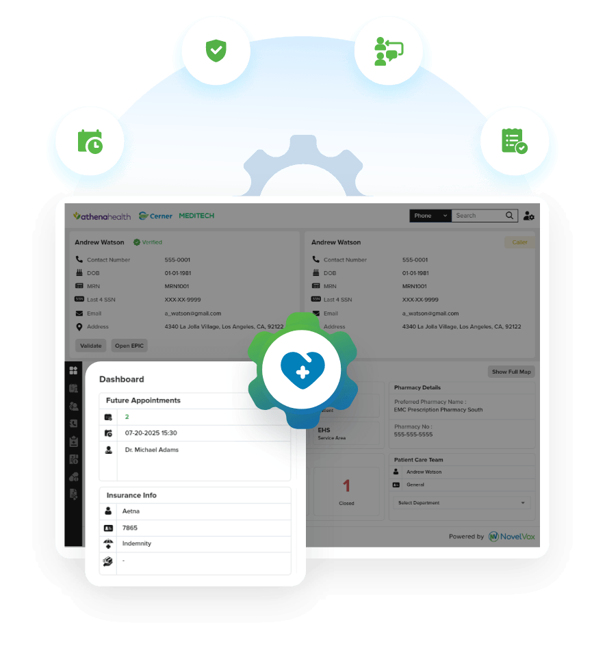 Surface patient records instantly and guide agents through structured verification steps inside the unified desktop. Reduce lookup time while maintaining accurate identity validation.